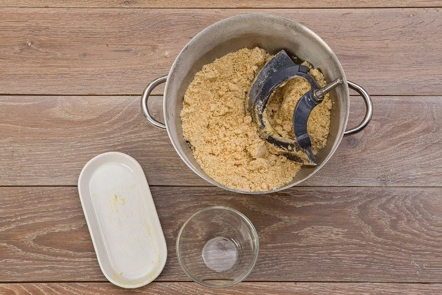 ШАГ 2 Добавьте масло и замешайте руками до состояния хлебных крошек, добавьте сахар, перемешайте.