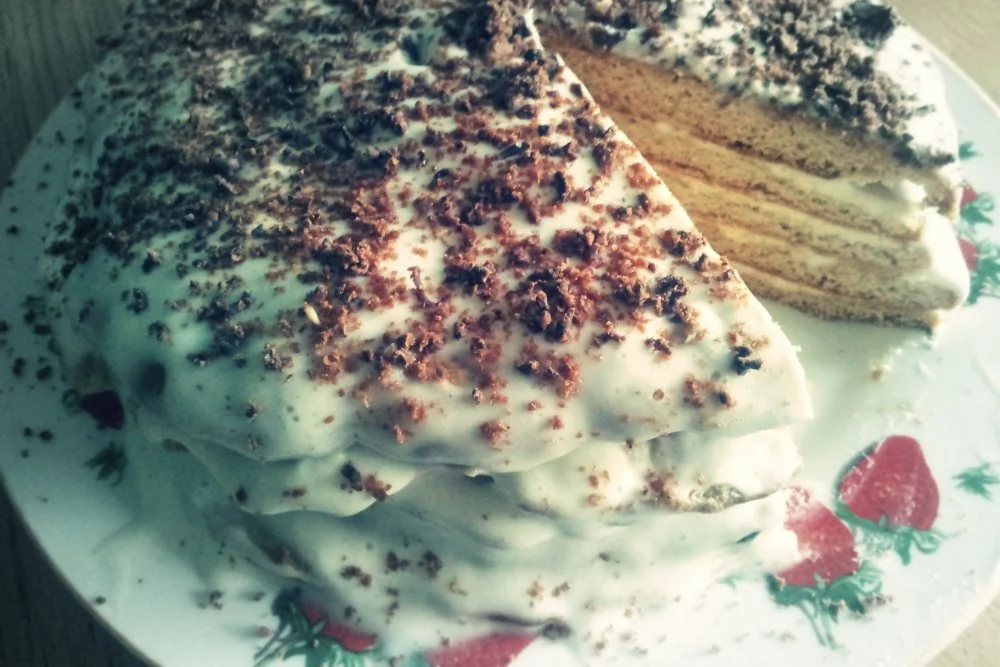 ШАГ 6 Остывшие коржи собрать в торт, промазывая кремом (достаточно пары столовых ложек), и дать пропитаться.