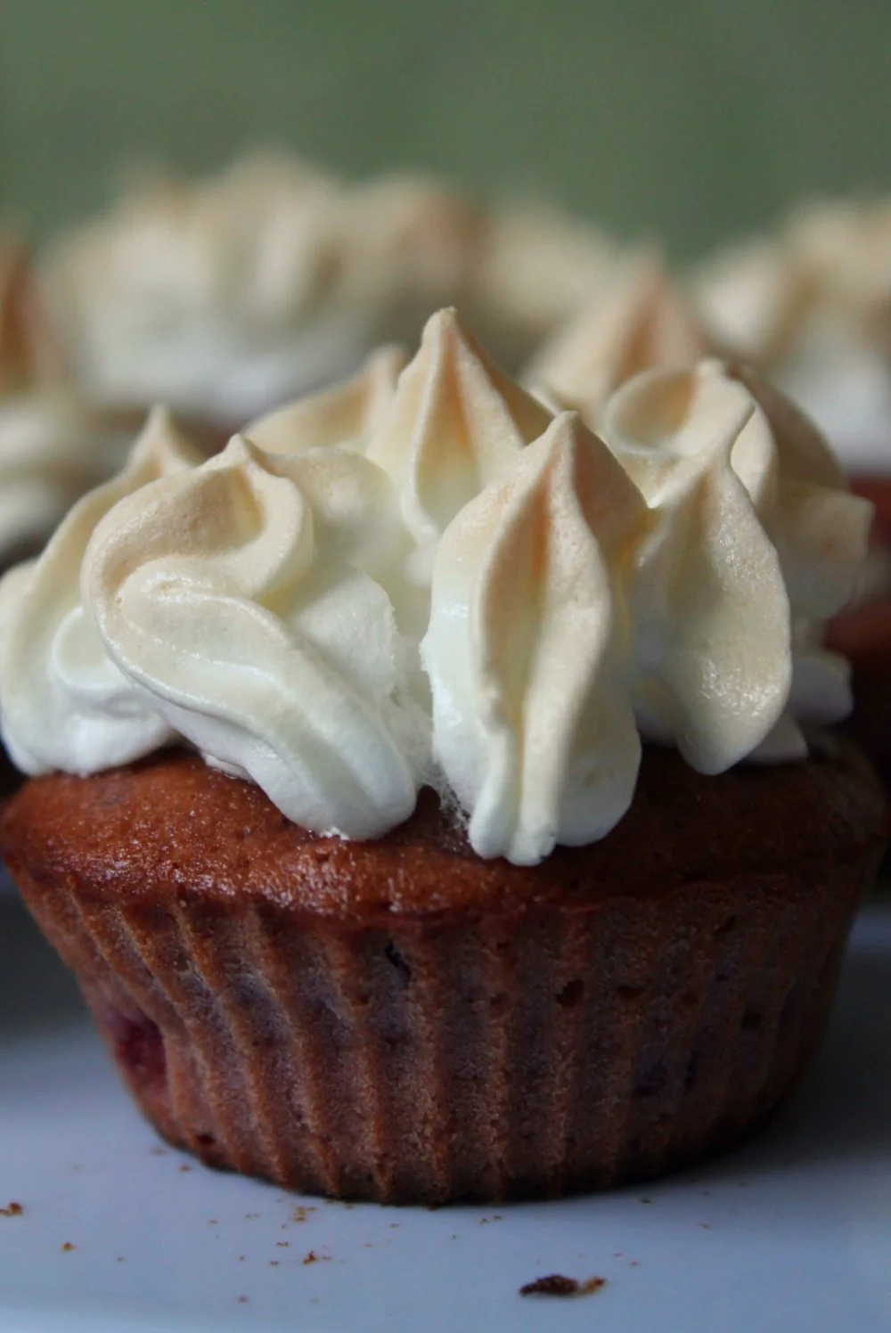 ШАГ 10 Выложить крем в кондитерский мешок, украсить подостывшие капкейки и поставить в духовку на