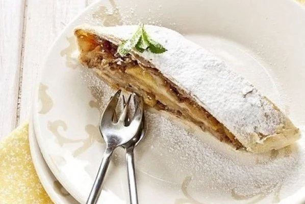 ШАГ 4 На тесто выложить орехи, затем — яблочную начинку и при помощи полотенца свернуть в рулет. Переложить рулет на противень и выпекать при температуре 180 градусов в течение 30 минут или до золотистого цвета. Готовый штрудель остудить и посыпать сахарной пудрой.