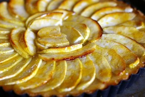 ШАГ 3 Нарезать яблоки тонкими ломтиками, сбрызнуть соком. Джем подогреть и смазать им тесто. Выложить яблоки кругами, посыпать оставшимся сахаром, полейте коньяком. Сверху выложите мелко порезанное масло.