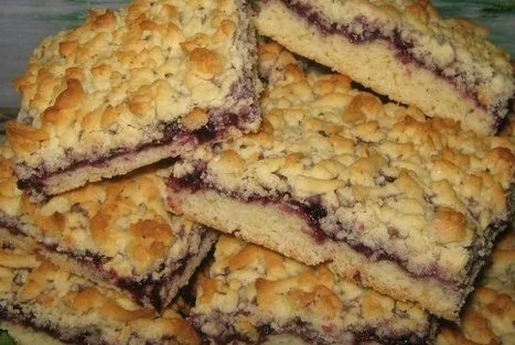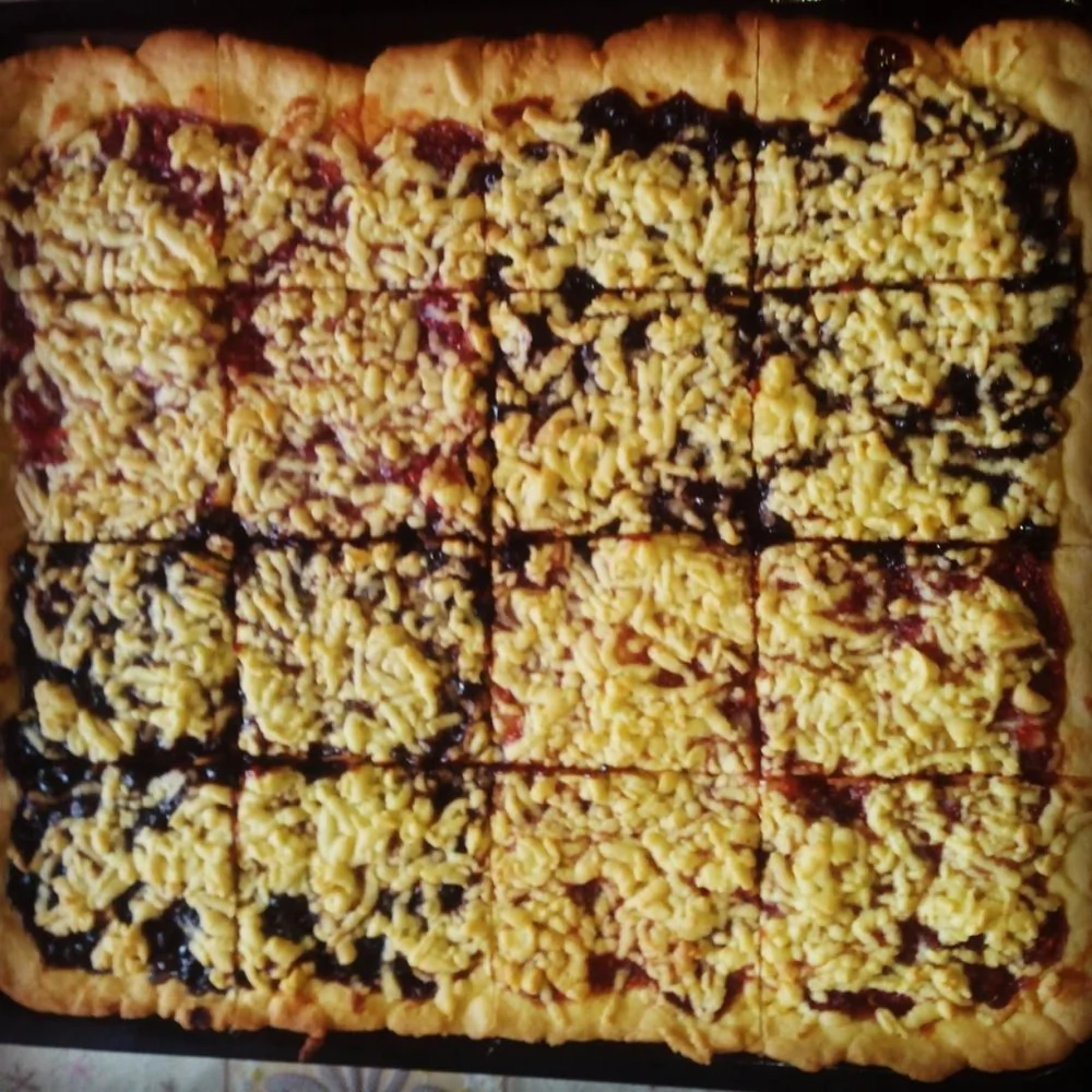 ШАГ 4 По всей длине противня выложить тесто ровным слоем. После намазать слой варенья. Можно брать любое, но лучше всего подходит смородиновое или черничное. Верх покрыть вторым слоем теста (только его предварительно нужно натереть на терке).