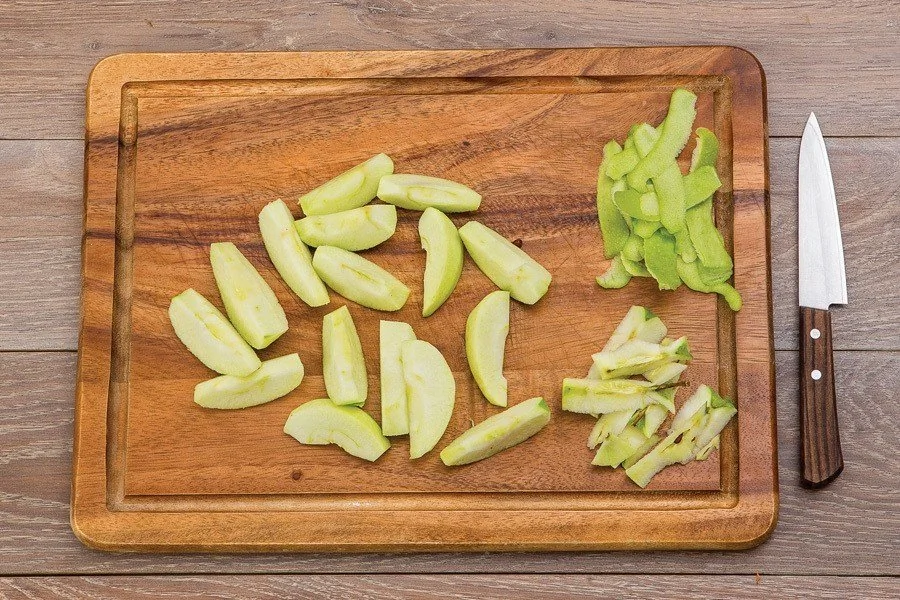 ШАГ 1 Очистите яблоки от кожуры, удалите семена и нарежьте на восемь частей.