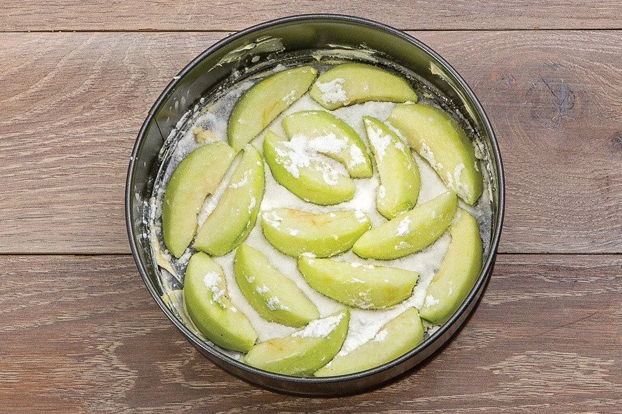 ШАГ 5 Вылейте тесто на яблоки, отправьте в заранее разогретую до 190 градусов духовку и выпекайте в течение 25 минут.