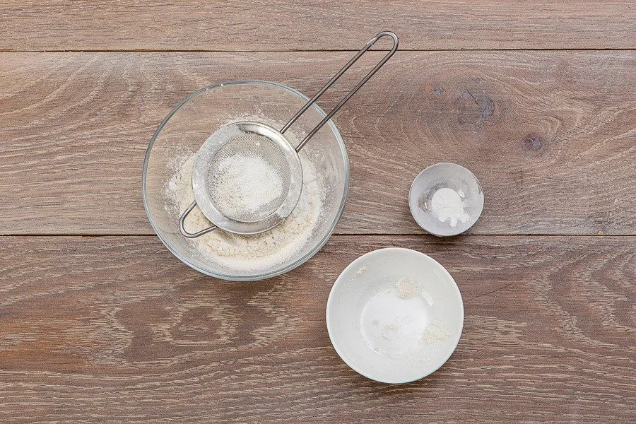 ШАГ 3 Просейте муку, смешайте с разрыхлителем, добавьте шепотку соли.