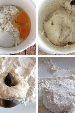 ШАГ 1 В средней миске смешайте муку с разрыхлителем и солью. Творог смешайте с яйцами, сахаром и ванилью и взбейте в комбайне до однородной массы. Добавьте сухую смесь и перемешайте. Масса будет слегка липучей.