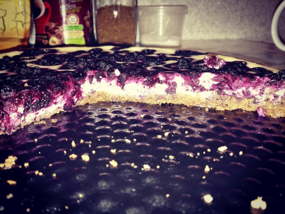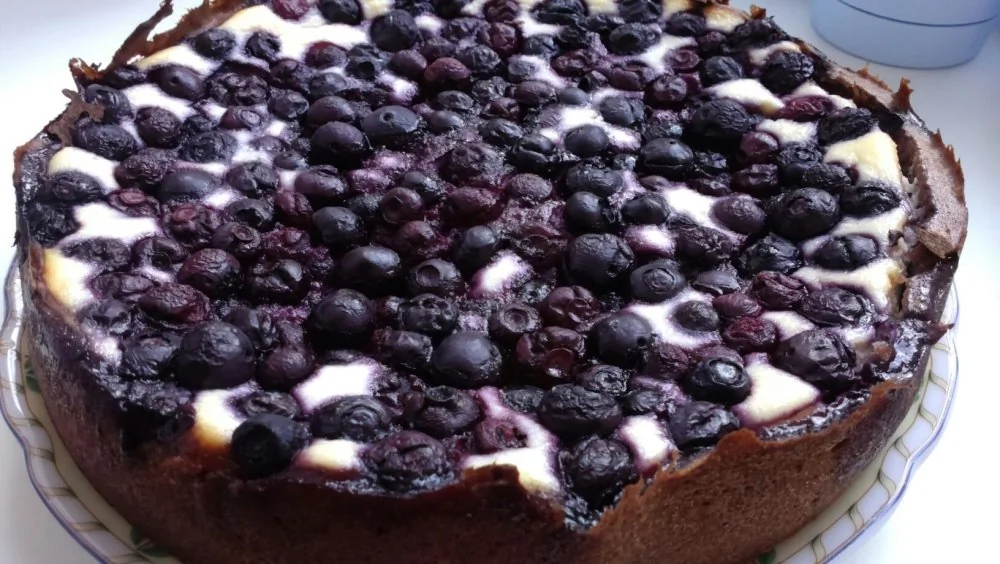 ШАГ 6 Полученную творожную начинку аккуратно выложите на шоколадную массу, распределите ложкой по всей поверхности, сверху высыпьте чернику.
