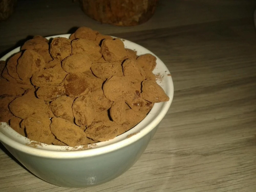 ШАГ 5 Дать шоколаду застыть в прохладном месте — 2-х часов вполне достаточно. При помощи силиконовой лопатки или рук снять драже с подложки и обвалять обвалять в просеянном какао-порошке.