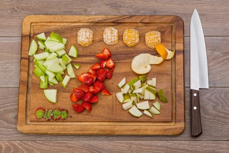 ШАГ 1 Мандарины очистите и нарежьте полукольцами, яблоко и 0,5 груши нарежьте кубиком, разрежьте клубнику на 4 части.