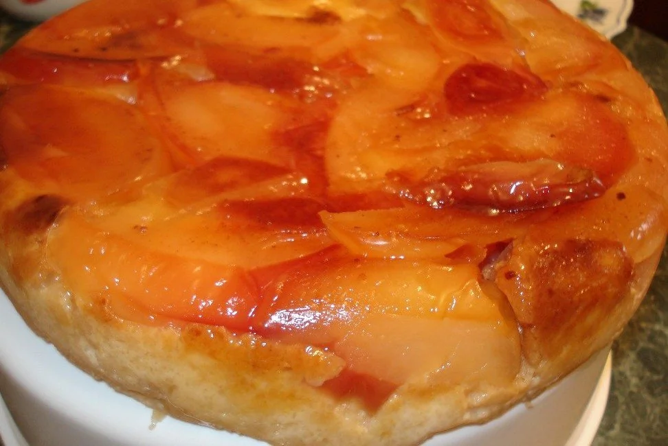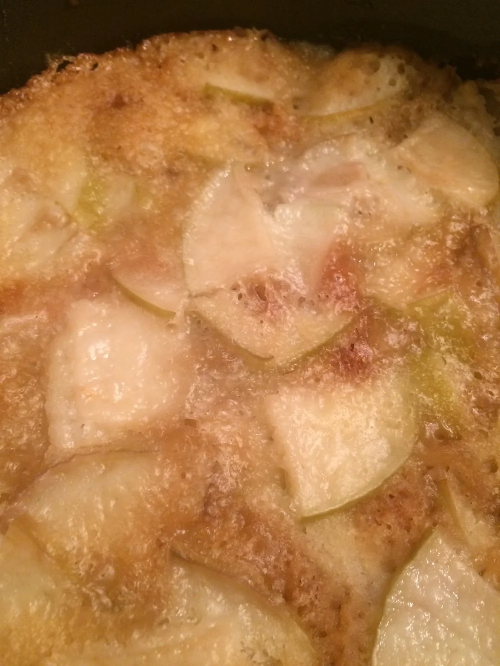ШАГ 4 Остальные яблоки добавить в тесто, перемешать. Выложить тесто поверх яблок, закрыть крышку, включить режим «Выпечка» на 1 час, затем дать еще постоять 15–20 минут в режиме подогрева. Перевернуть из кастрюльки на тарелку, посыпать верх ванильным сахаром, если есть.