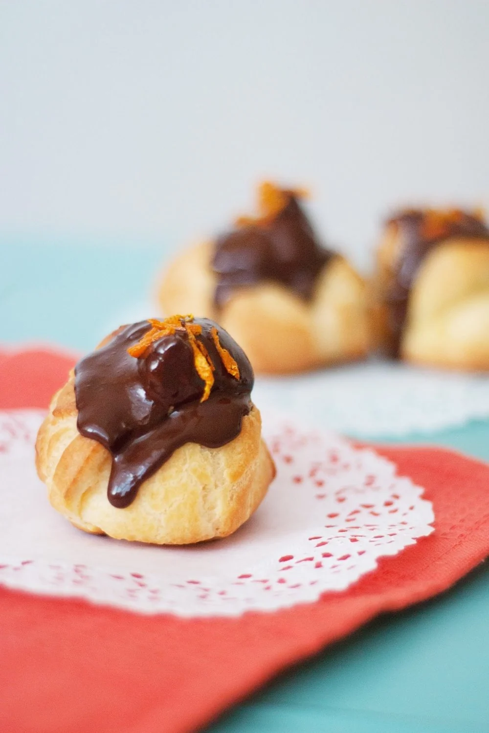 ШАГ 7 Готовые остывшие профитроли заполнить апельсиновым кремом с помощью шприца и полить растопленным на водяной бане темным шоколадом.