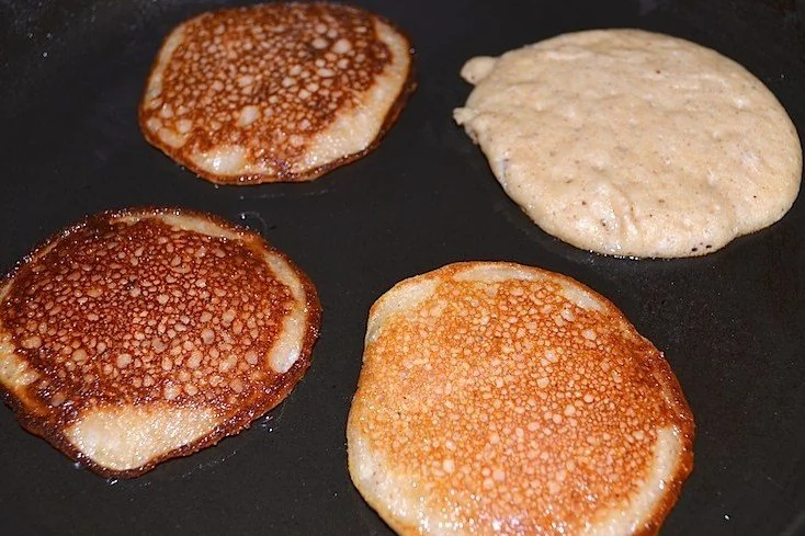 ШАГ 6 В разогретую сковороду налить немного растительного масла (оладушки впитывают масло, поэтому периодически нужно добавлять масло в сковороду), выкладывать оладушки столовой ложкой. Безглютеновые оладьи выпекаются на среднем огне, но требуют больше времени, примерно по 1,5–2 минуты с каждой стороны. Помните, чем больше растительного масла в сковороде, тем более дырявые получаются оладушки.