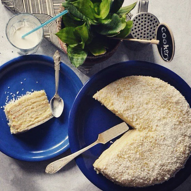 ШАГ 3 Коржики выпекать несколько минут. Пока коржи еще теплые, смазать их кремом. Посыпать кокосовой стружкой.