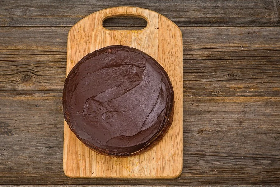 ШАГ 6 Растопите на водяной бане оставшееся масло с оставшимся темным шоколадом, вылейте глазурь на торт, распределите равномерно по всей поверхности торта.