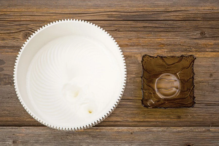 ШАГ 3 Добавьте часть белков в тесто, чтобы размягчить его, перемешайте лопаткой, введите оставшиеся белки, чтобы тесто получилось жидковатым.