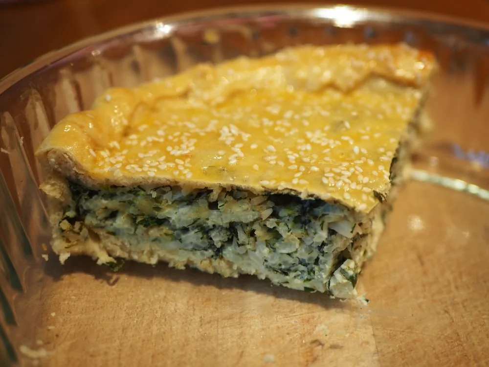 ШАГ 3 Начинка. Нарезать щавель, зелень, лук, сыр. Надавить чеснок. Добавить яйца (1 желток оставить для смазывания теста), рис, соль и перец — по вкусу. Перемешать.
