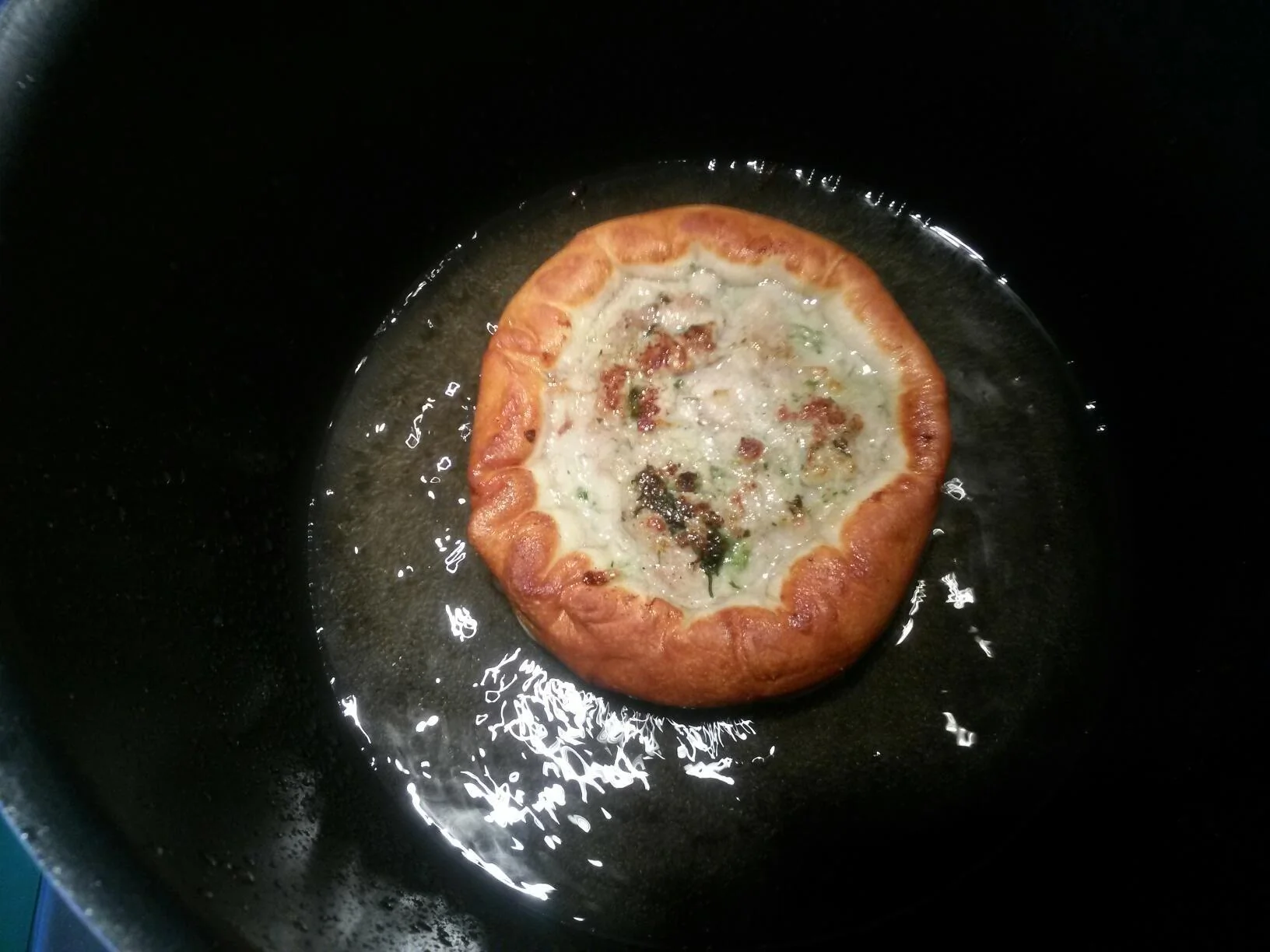 ШАГ 4 На лепешки уложить фарш. Края завернуть. Жарить на горячем масле (или во фритюре), опуская открытым отверстием вниз.