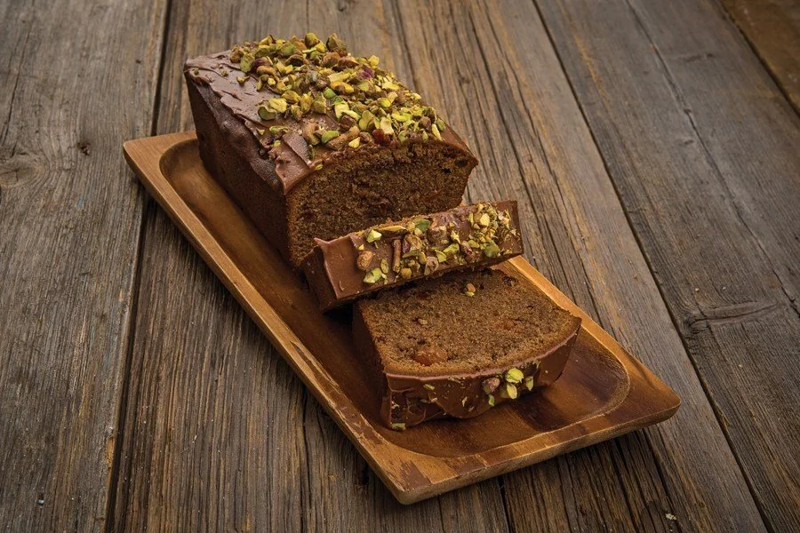 ШАГ 6 Растопите оставшееся масло, шоколад и оставшийся амаретто на водяной бане, полейте кекс; порубите фисташки крупно.