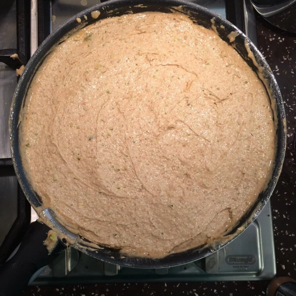 ШАГ 12 В последнюю очередь при постоянно работающем миксере добавляем просеянную муку, миндальную муку, гречневую муку, молотые фисташки и разрыхлитель и хорошо перемешиваем. Тесто должно получиться консистенции густой сметаны, если необходимо можно немного добавить молока. Сверху на сковороду с крыжовником переливаем тесто.