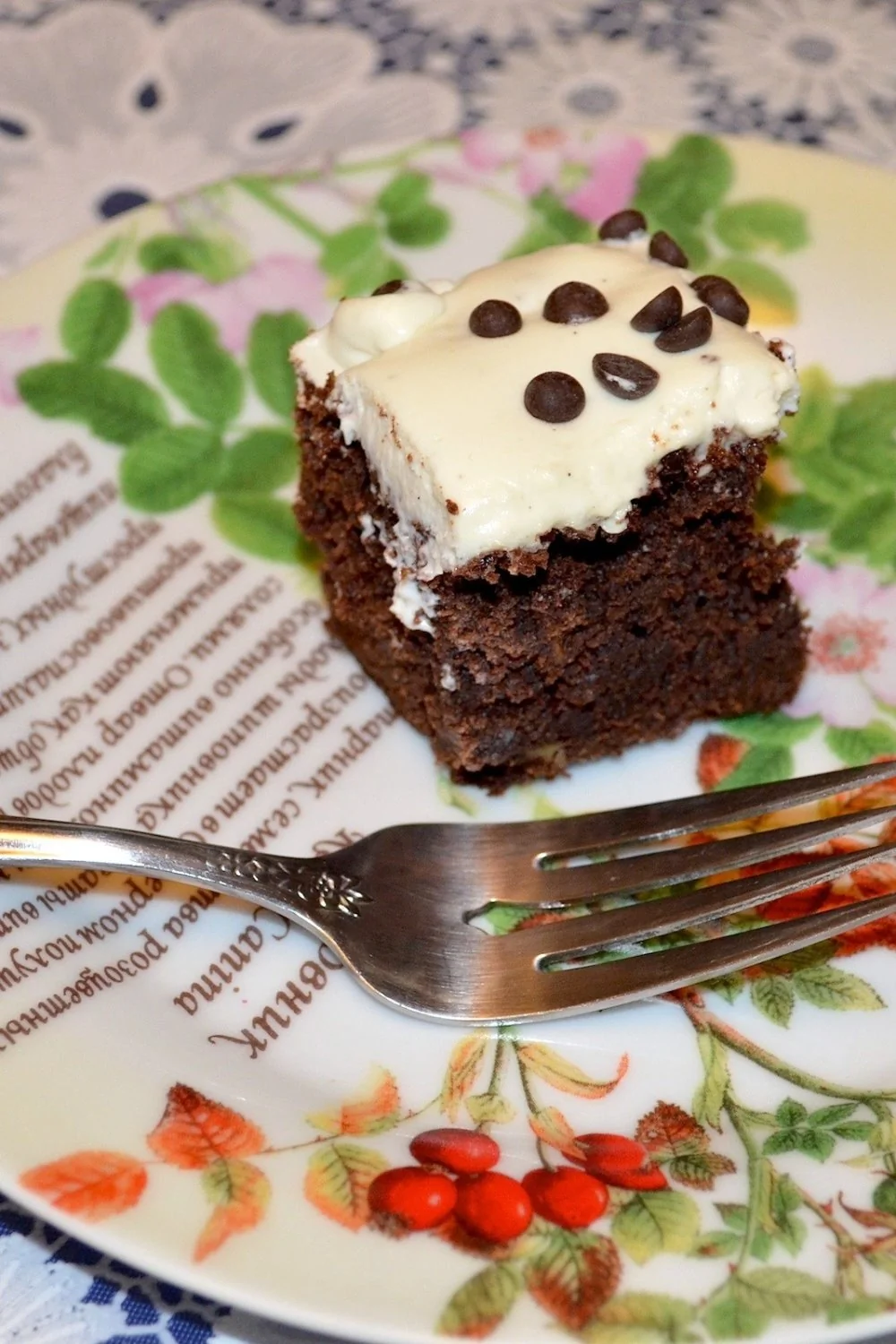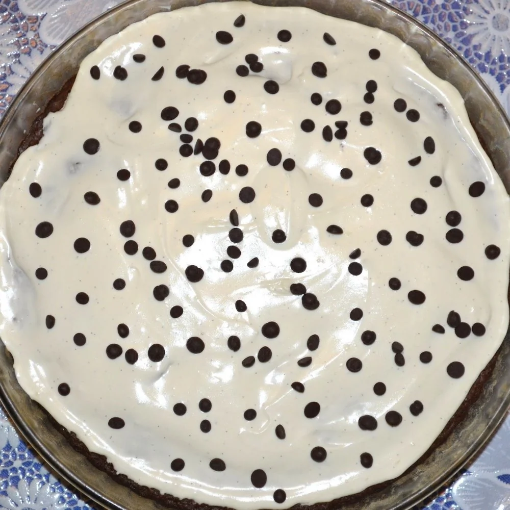 ШАГ 9 Смазать сырным кремом верх остывшего брауни, украсив шоколадными чипсами.