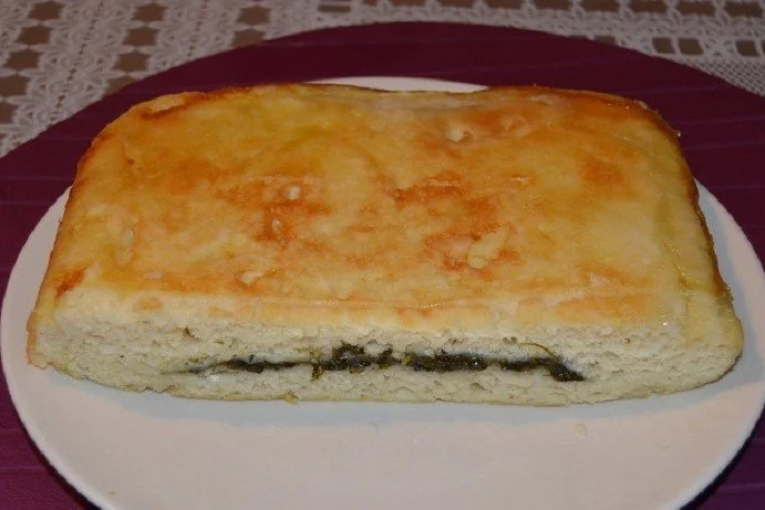 ШАГ 8 Из приготовленного картофельного дрожжевого теста раскатываем ровный пласт, смазываем одну сторону взбитым яйцом и кладем в форму, предварительно смазанную растопленным сливочным маслом, так, чтобы смазанная взбитым яйцом сторона пласта теста легла на растопленное сливочное масло. Выкладываем на не смазанную сторону пласта теста приготовленный щавель.
