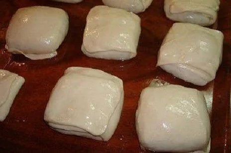 ШАГ 8 Посыпать на тесто щепотку манной крупы. Сложить края теста к середине, смазывая растительным маслом, образовывая крадрат.