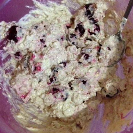 ШАГ 2 Добавить к тесту вишню, а на плоскую тарелку высыпать оставшиеся хлопья.