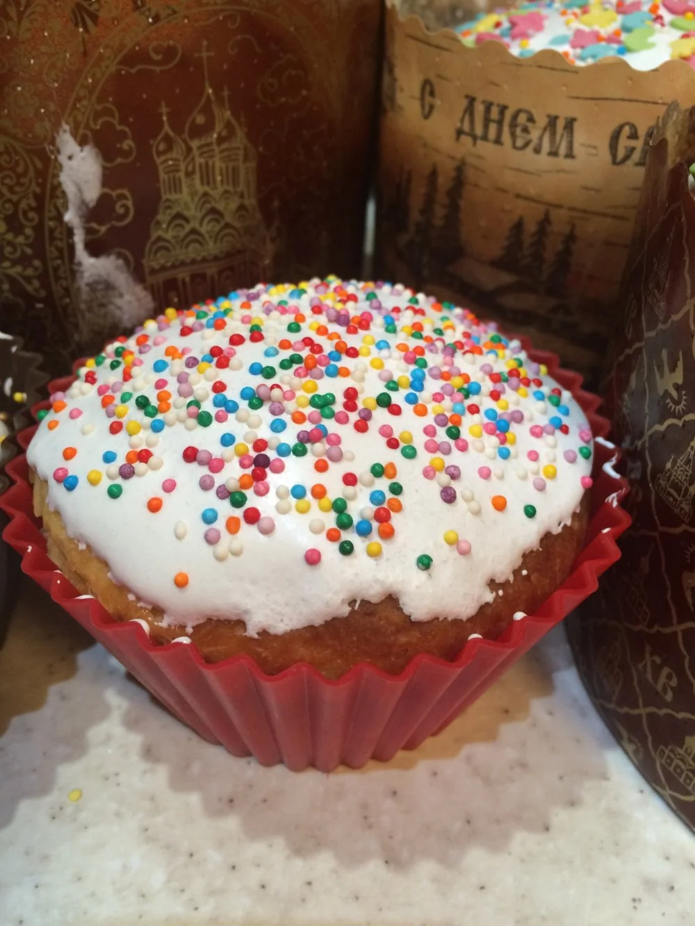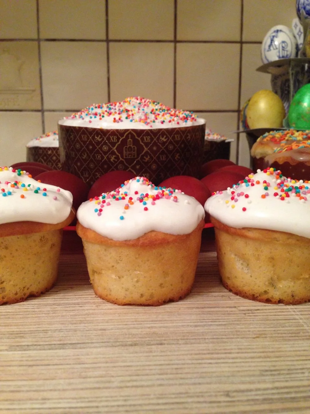 Готовые горячие куличи смазать глазурью и посыпать кондитерской посыпкой или украсить цукатами.