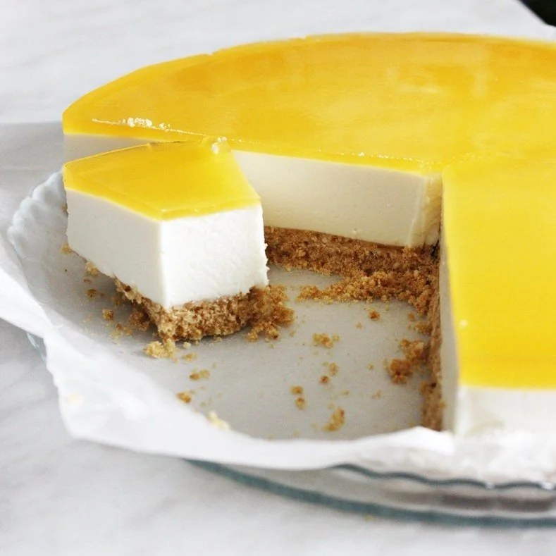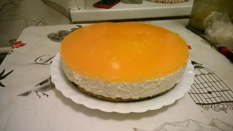 ШАГ 4 Достаем коржик из печенья и выливаем сверху творожную массу. Ставим в холодильник, пока чуть чуть не загустеет.