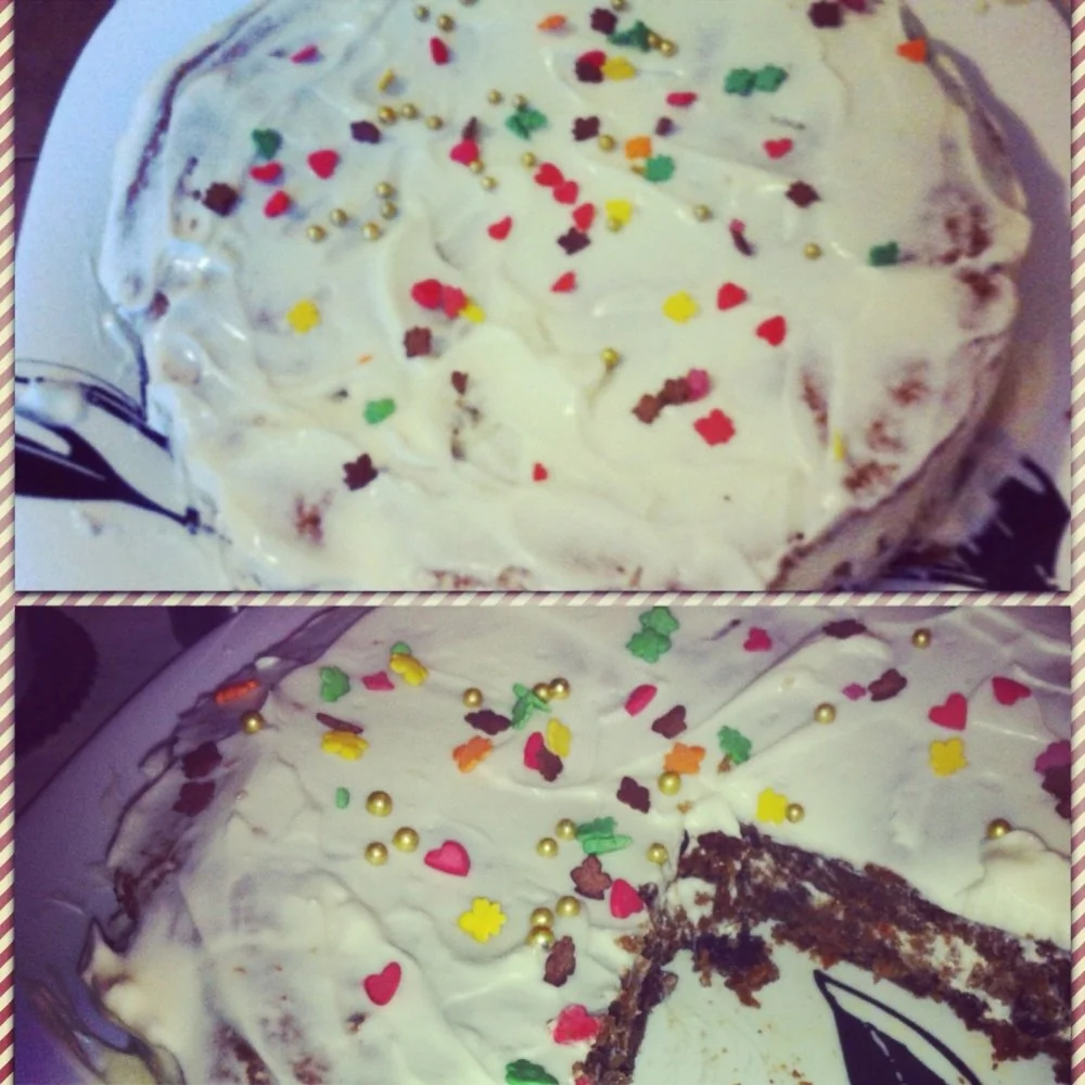 ШАГ 3 Пирог остудить до комнатной температуры, вынуть из формы и разделить вдоль на 2 коржа. Делаем начинку для торта: взбиваем сыр комнатной температуры с сахарной пудрой и ванильным экстрактом, перемешиваем до однородности. Смазываем начинкой нижний корж, накрываем вторым и обмазываем оставшимся кремом верх и бока торта. Крошками от обрезки коржей обсыпаем бока торта и украшаем верх по желанию.