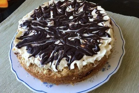 ШАГ 5 Остудить, выложить сметанный крем (взбить сметану и 3 столовые ложки тростникового сахара). Растопить шоколад и украсить торт.