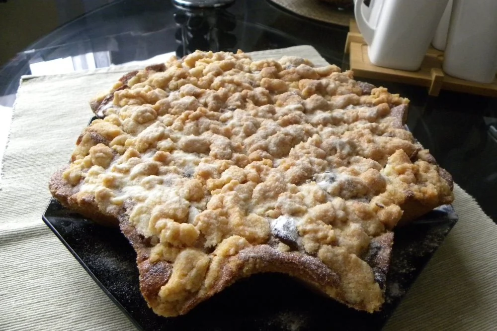 ШАГ 8 Сверху пирог присыпать крошкой, приготовленной из 0,5 стакана сахара, 50 г сливочного масла и 0,5стакана муки.