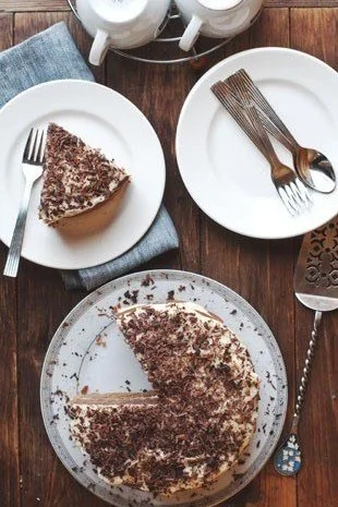 ШАГ 8 Готовые коржи остудите, каждый разрежьте ниткой на 2 части,чтобы получилось 4 коржа, и смажьте верх каждого кремом. Сложите коржи один на другой. Верхушку украсьте оставшимся шоколадом, натрите его на крупной терке.