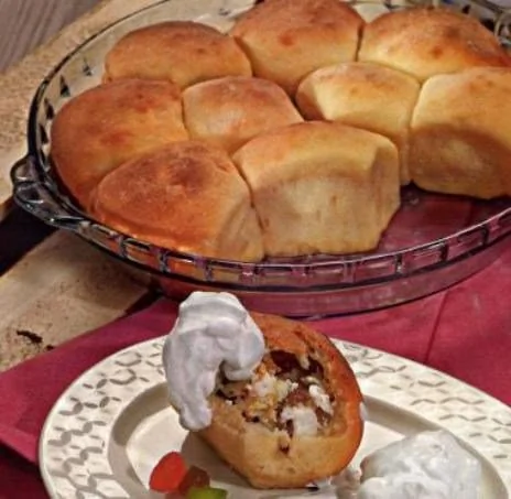 ШАГ 8 Разогреть духовку до 180 градусов. Оставшееся сливочное масло растопить. Обмакнуть каждую булочку в масло и выложить плотно друг к другу в круглую форму. Оставшееся яйцо взбить и смазать им поверхность пирога. Выпекать 25–30 минут.