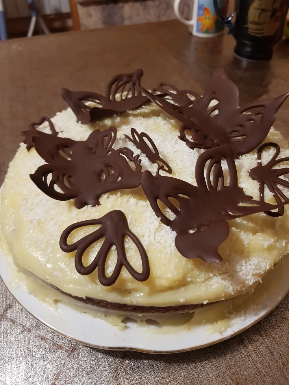 ШАГ 3 Корж разрезать чуть теплым на 3 части, промазать кремом. Украсить кокосовыми чипсами.