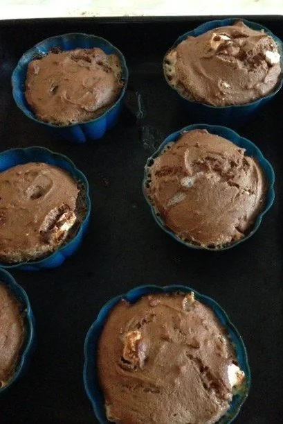 ШАГ 4 Подготовить формы для кексов. смазать растительным маслом, разогреть духовку до 190 градусов. Заполнить форму на одну треть тестом, сверху налить немного сгущенного молока. выложить банановые кружочки и закрыть тестом (но не до краев формы, т.к. кексы поднимаются в процессе выпечки). Проделать данную операцию со всеми кексами и отправить на 20 минут в духовку.