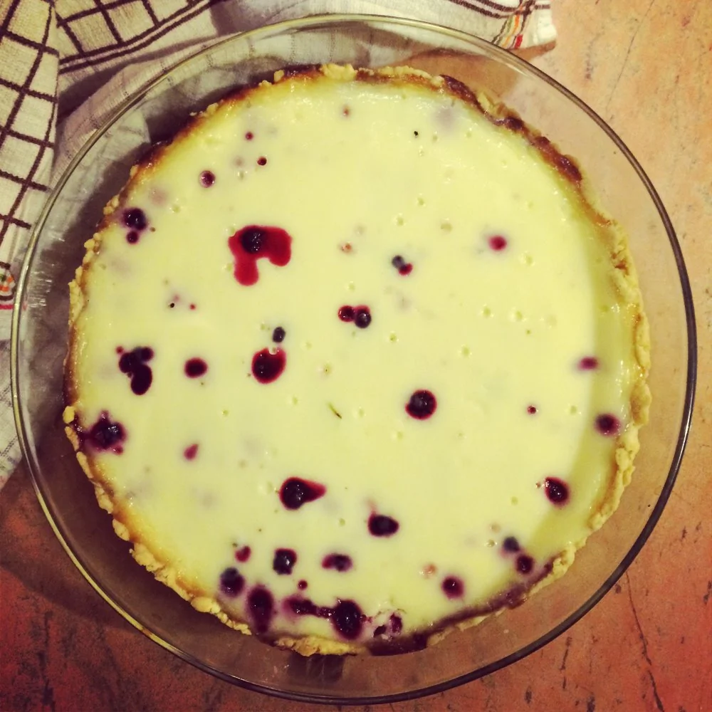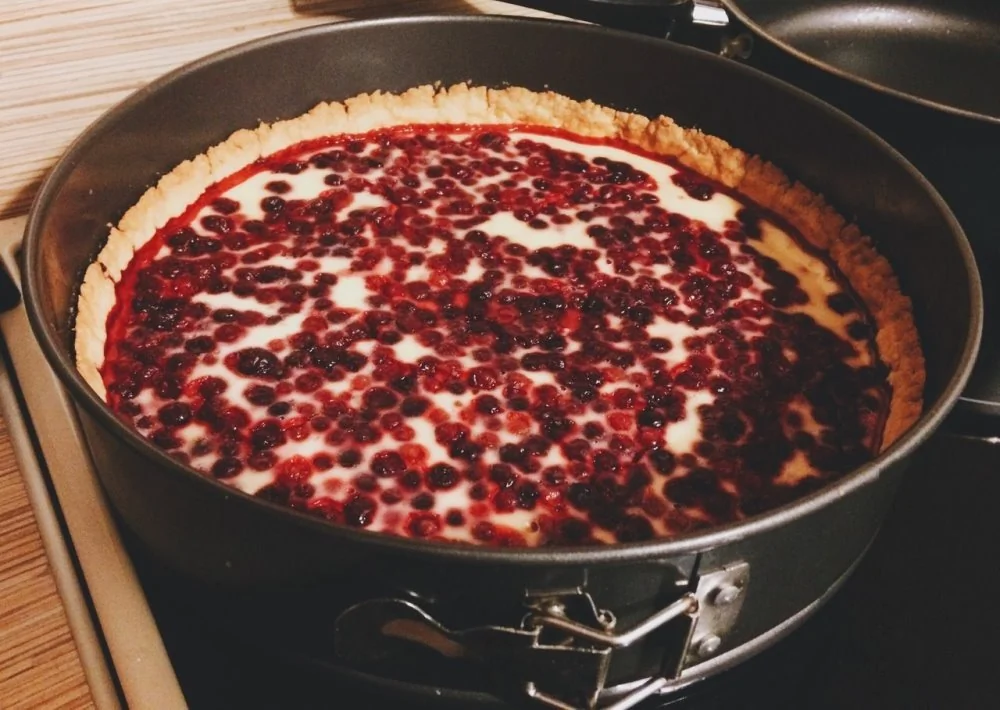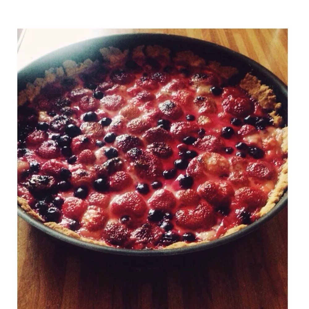 ШАГ 9 Когда песочная основа застынет в холодильнике/морозилке достаньте ее. Выложите ягоды и залейте сметанным кремом.
