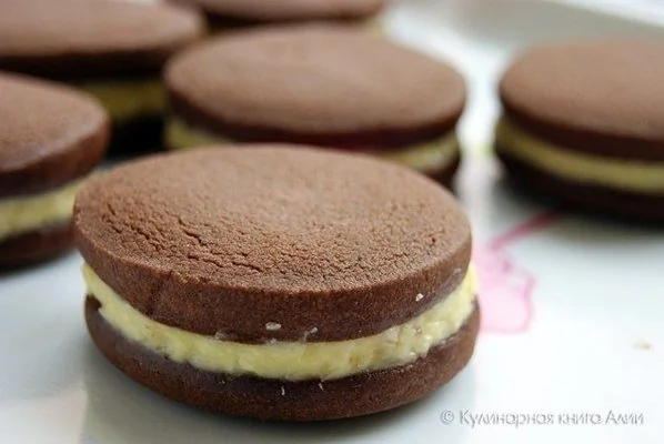 ШАГ 3 Остывшее печенье намазать кремом. Распределить крем по поверхности ровненько. Накрыть вторым печеньем, чуть прижимая, чтобы крем с краев немного вылез. Затем пальцем провести, убирая лишний крем и ровняя полоску крема. Можно покрыть шоколадной помадкой, как предлагает автор, или любой шоколадной глазурью, а можно украсить кремом. Любым, каким хотите. Я сделала самый простой шоколадный масляный крем.