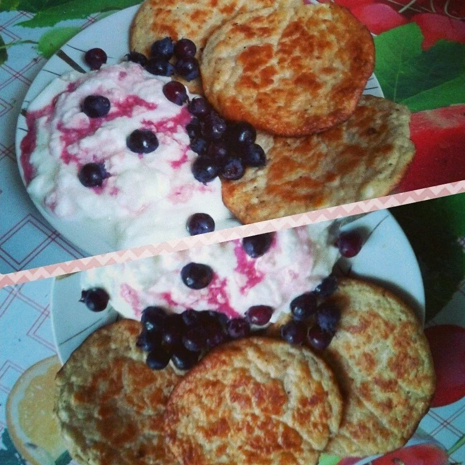 ШАГ 1 Отделить желток от белка. Желток смешать с творогом, бананом, сахарозаменителем, разрыхлителем и измельченными в муку овсяными хлопьями. Белок взбить миксером в пену, осторожно добавить в тесто, перемешать.