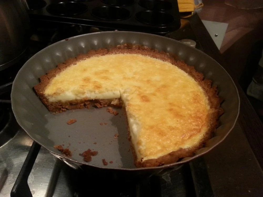 ШАГ 3 В форму на дно выложить бананы, затем вылить сливочную массу (часть бананов поднимется вверх, но это не страшно), поставить в заранее разогретую до 170 градусов духовку, выпекать около 1 часа (готовность можно определить по консистенции начинки, если чуть покрутить форму и начинка «не дрожит» — значит пирог готов. Духовку выключить, дверцу чуть приоткрыть (если нет фиксатора, подложить полотенце) и дать пирогу там немного «отдохнуть», затем достать и охладить при комнатной температуре и 1–2 часа выдержать в холодильнике, затем нарезать на порционные кусочки.