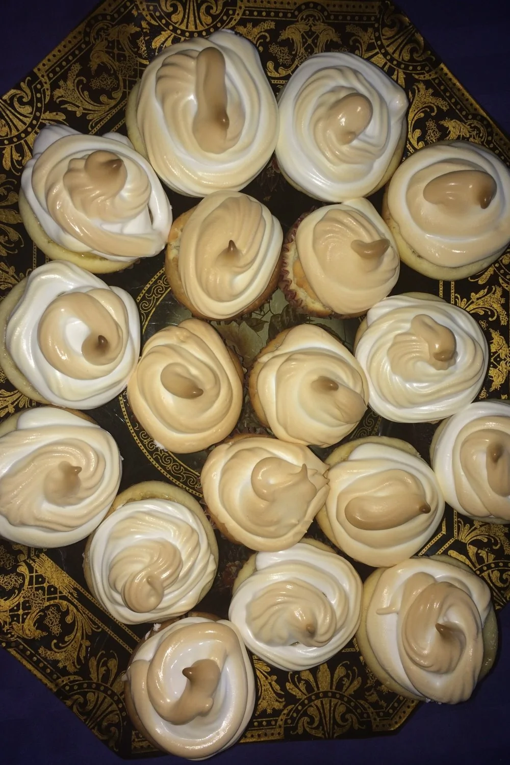 ШАГ 4 При помощи ножа вырезаем в капкейке круглое отверстие практически до его донышка. Срезаем верхушку вынутой сердцевинки. Начиняем кекс лимонным курдом. Прикрываем срезанной верхушкой наш капкейк. Сверху наносим меренгу. Ставим в уже разогретую до 200 градусов духовку минуты на 5 до подрумянивания меренги (можно еще газовой горелкой, если есть).