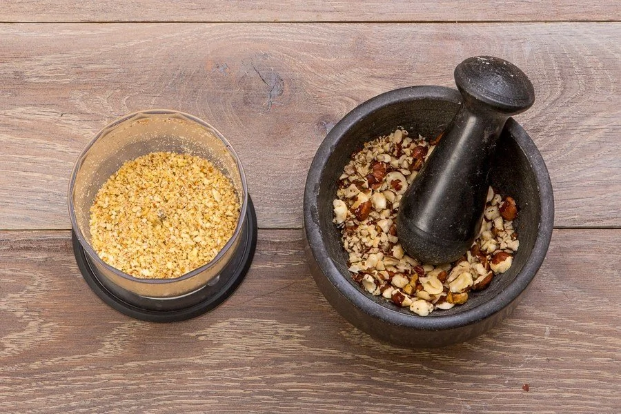 ШАГ 2 Измельчите в блендере миндаль и грецкие орехи в мелкую крошку; слегка измельчите в ступке или раздавите плоскостью ножа фундук.