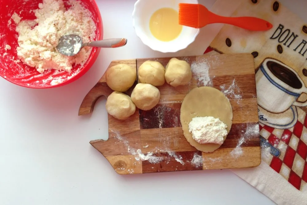 ШАГ 6 Положите сочники на бумагу для выпечки или смазанный противень. Сами сочники смажьте желтком с водой.