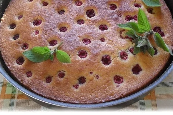 ШАГ 6 Готовый пирог украсить мятой и малиной (или другими ягодами).