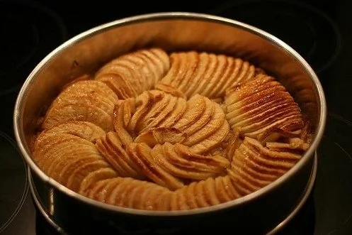 ШАГ 6 На тесто выложите припущенные на сковороде яблоки, а сверху аккуратно нарезанные половинки яблок. Декорируйте яблоками середину торта мажьте торт сверху абрикосовым джемом и посыпьте сахарным песком.