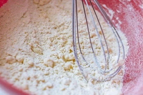 ШАГ 2 Сахар 1/4 стакана + мука 1 стакан + соль + разрыхлитель смешать. В эту смесь натереть маргарин на терке. Хорошо перемешать до образования мелкой мучной крошки. Духовку разогреть до 200 градусов.