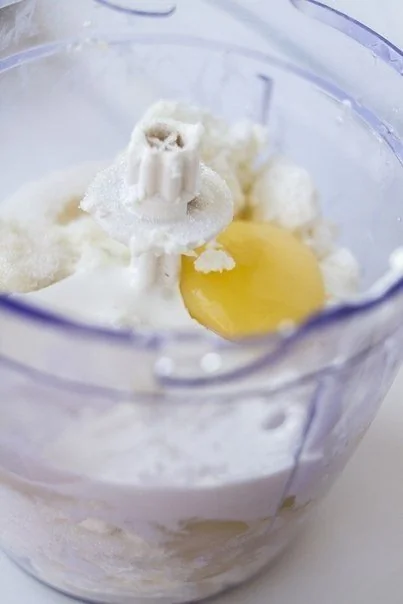 ШАГ 3 Для начинки творог смешать с сахаром и сметаной. Я делаю это в блендере. Яйцо пригодится, если необходимо скрепить жидкую массу. Но тогда начинка будет совсем другая на вкус, по типу творожной запеканки. Делала оба варианта, больше нравится без яйца.