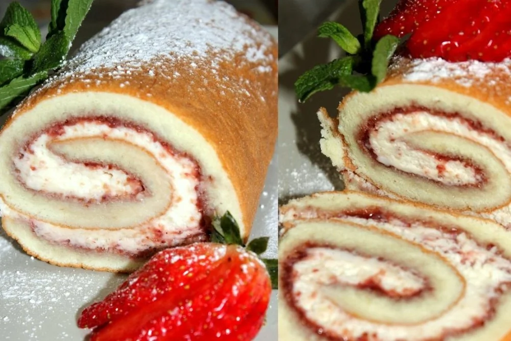 Бисквитный рулет с клубничным вареньем и взбитыми сливками