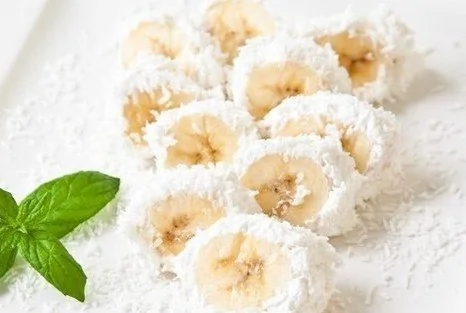 ШАГ 1 Окуните очищенные бананы во взбитые сливки, а затем обваляйте в кокосовой стружке.