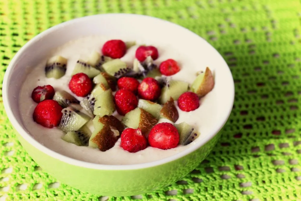 ШАГ 3 Сверху украсить сезонными ягодами и фруктами (кроме ягод отлично подойдут мягкие фрукты: персики, киви, ананас, для любителей орехи или мюсли).